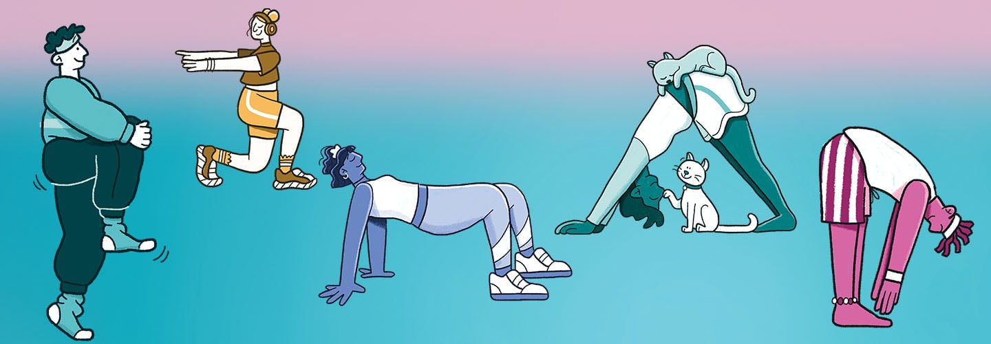 It only takes a few minutes to warm up your muscles with a simple stretching routine, Costigan says. Try these stretches before and after a workout, when you feel tense, or anytime you need a break.